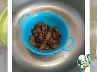 Сушеные грибы залить чуть горячей водой для набухания. Когда грибы набухнут, вылить все в дуршлаг и дать стечь лишней воде. Затем грибы мелко нарезать. |