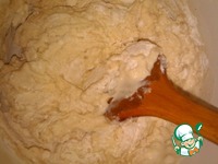 Растворившиеся дрожжи перемешать и добавить в муку вместе с большей частью всей оставшейся воды. |