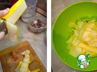 С помощью ножа для чистки овощей нарезать кабачок тонкими ломтиками. |
