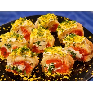 7. С рулета убираю пленку, нарезаю на порционные кусочки, сверху наношу немного крема, присыпаю мелко натертым желтком и измельченным укропом.