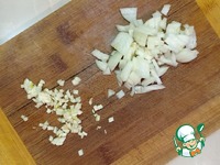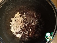 Затем добавить нарезанные лук и чеснок, слегка поперчить и жарить до готовности лука на среднем огне. |