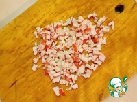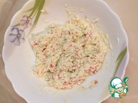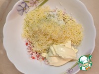 В глубокой миске соединить: яйца, сыр, крабовые палочки и пропущенный через пресс чеснок. |