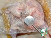 Форму с цыпленком накрыть фольгой и отправить на 30мин в духовку, заранее разогретую до 180С. После чего снять фольгу и запекать еще 20 - 30мин до готовности. |