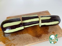 Баклажан моем и полосками снимаем шкурку (полностью чистить не нужно). Если баклажан большой, делим его на три равные части, если поменьше, то соответственно на две части. |