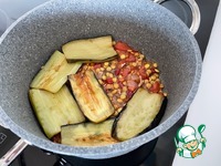 В емкость (в которой будем готовить) выкладываем 1/3 часть овощной смеси, на нее - половину пластин баклажанов, сверху опять овощи, баклажаны и последним слоем будет опять овощная смесь. |