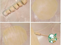 Разделить тесто на 6 частей, тонко раскатать и разрезать фигурным ножом на полоски шириной 3-4см. |
