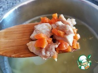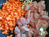 Куриное филе (у меня филе бедра) вымыть, нарезать небольшими кусочками и отправить вместе с чесноком и морковью на сковороду. Пассеровать, помешивая, на небольшом огне ~7 минут. |