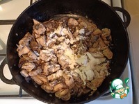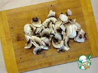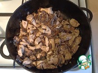 Лук и грибы обжаривать на растительном масле до тех пор, пока из грибов не выпарится лишняя жидкость. |