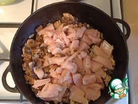 Затем в сковороду добавить кусочки курицы и жарить, помешивая 7-10мин. |