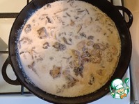 Сметану размешать с водой, посолить, поперчить и вылить эту заливку в сковороду с курицей и грибами. |