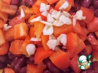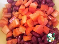 В салатницу выложить фасоль, а также нарезанные мелкими ломтиками помидоры и перец. |