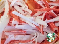 Разобрать крабовые палочки на волокна и выложить в салатницу. Волокна будут визуально напоминать краба. |