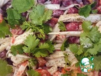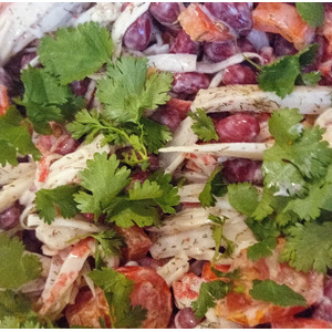 Посыпать салат мелко нарезанной кинзой, заправить майонезом и перемешать. |