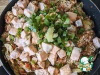 Добавить лосось, зелёный лук и чеснок, перемешать и тушить 2-3 минуты. |