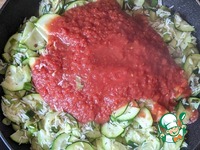 Добавить пассерованные томаты и воду (или бульон), перемешать. Закрыть крышкой и тушить минут десять на среднем огне. |