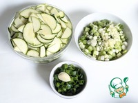 Цукини нарезать тонкими полукольцами, белую часть лука и 2 дольки чеснока отдельно. Зелёную часть нарезать отдельно отставить в сторону вместе с одной долькой чеснока. |