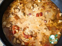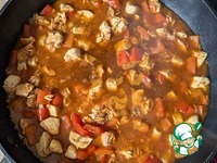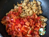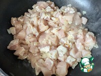 Добавить куриное мясо, продолжить жарить до побеления. Пока обжаривается мясо, нарезать кубиками болгарский перец. |