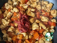 Добавить пасту чили и томатную пасту, перемешать. Паста чили не обязательный ингредиент, мы любим острое, ниже дам ссылку, которой пользуюсь я. |