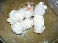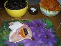Каждый окорочок фаршировать черносливом и курагой, складывая два сухофрукта вместе. На один окорочок по 2-3 шт. чернослива и кураги. Перевязать плотно кулинарной веревкой. |