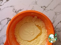 Перемешиваем отдельно желтки с сахаром. Затем добавляем их в крошку. Также добавляем в крошку сметану. |