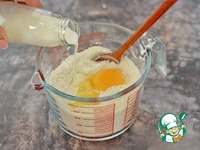 Начните замешивать тесто в рабочей ёмкости при помощи лопаточки. Растопите сливочное масло и в процессе замеса добавьте его в тесто. |