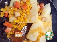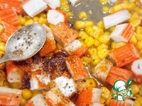 Разогреть сливочное масло, добавить кукурузу и крабовые палочки. Посолить, поперчить, добавить паприку. Жарить минуту. |