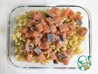 Слить воду с рожек, высыпать в форму, добавить лосось. |
