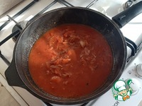 Томатный соус влить в сковороду с обжаренным луком, добавить воду и прогреть. Половину соуса переложить в мисочку. |