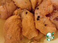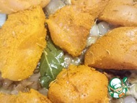 Пока лук готовится, в отдельной ёмкости смешать куркуму, зиру, черный перец, перец чили и чайную ложку соли. Обвалять в этой смеси кусочки курицы |