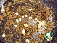 На сковороде разогреть 2 ложки оливкового масла и жарить в течение 2-3 минут кориандр, зиру, красный жгучий перец, 2 зубчика чеснока. |