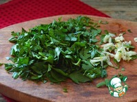 Петрушку вымыть, обсушить, нарубить с оставшимся чесноком. Добавить в сковороду вместе со сливочным маслом, перемешать, тушить 5-7 минут. |