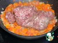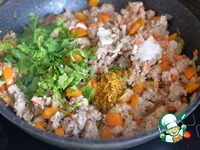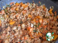 Добавляем к овощам фарш индейки, перемешиваем, обжариваем 10 минут. Кусочки фарша разбиваем толкушкой. |