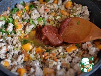 Кладём томатную пасту. Я всегда кладу в середину, в масло. От масла вкус томатной пасты становится нежнее и более раскрывается. |
