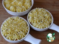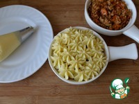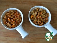 Делаем запеканку в большой форме или порционно. Кладём в формы (форму) обжаренный с овощами фарш. |