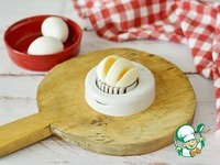 Яйца сварите вкрутую, очистите и нарежьте на тонкие ломтики вдоль яйца. Удобно это делать при помощи яйцерезки - так все ломтики будут ровные. |
