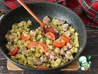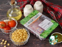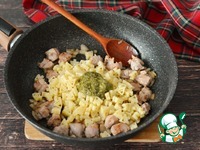 К обжаренной индейке добавьте отваренные макароны и соус песто. |