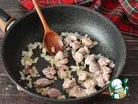 А пока варятся макароны, нарежьте мелко филе бедра индейки и лук. Обжарьте их на разогретом масле до золотистой корочки примерно 5-8 минут. |