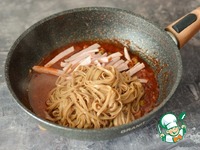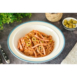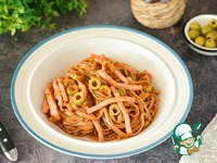 В сковороде нагрейте масло и поджарьте нарезанный мелко лук до золотистого цвета. Добавьте к луку томатную пасту, нарезанные оливки и разведите соус водой от варки лапши до желаемой густоты (мне понадобилось около 1,5 половников воды).