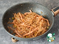 Примечание. Если вы решите вместо ветчины использовать куриное филе, то нарежьте его тонкой соломкой и обжаривайте вместе с луком примерно 5-8 минут. |