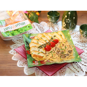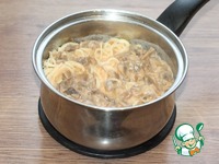 12. Выливаем соус в кастрюлю со спагетти и перемешиваем. |