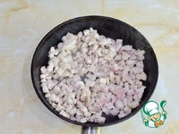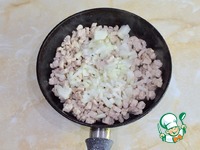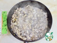 Мясо индейки нарежьте на небольшие кусочки и обжарьте на растительном масла 7-10 минут. |
