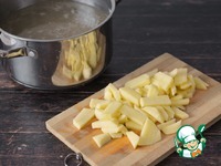 Картофель очистите и нарежьте соломкой. Добавьте его в кастрюлю с перловкой и варите примерно 15 минут, пока он не станет мягким. |
