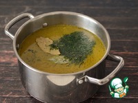 Затем добавьте в рассольник лавровый лист, нарубленный укроп и выключите плиту. Дайте рассольнику настояться примерно 15-20 минут и можно накрывать стол к обеду. |