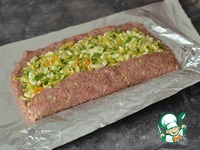 Расстелите на столе лист фольги или пергамента. Распределите на нём фарш, сформировав прямоугольник. Толщина слоя фарша должна быть примерно 1,5-2 см. |