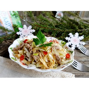 Описание: Хрустящий, сочный и лёгкий капустный салат. Думаете, это просто и скучно? Вовсе нет! Салат получается островатый, пикантный, сытный за счёт мяса индейки и нежный из-за яичных блинчиков. Попробуйте!