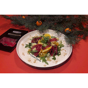 На тарелку положить рукколу, мандарины, мяско индейки свернув тонкие кружки нарезки в розочки |