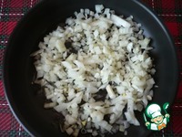 В сковороду наливаем небольшое количество растительного масла, разогреваем и высыпаем лук, нарезанный на мелкие кубики. Обжариваем его до прозрачности. |