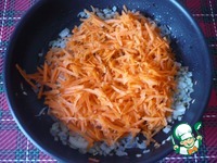 Затем к луку добавить морковь, натёртую на крупной тёрке. Жарим, периодически помешивая, 5-7 минут, до мягкости и лёгкого золотистого цвета. |