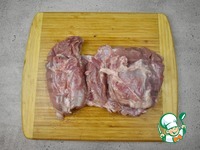 Филе бедра индейки выложите на доску, промокните мясо бумажным полотенцем. Срежьте, если имеются, соединительные ткани или жилки. |