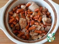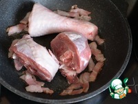 Берём горшок, в котором будем томить кассуле, кладём в него обжаренные голени вместе с беконом. |